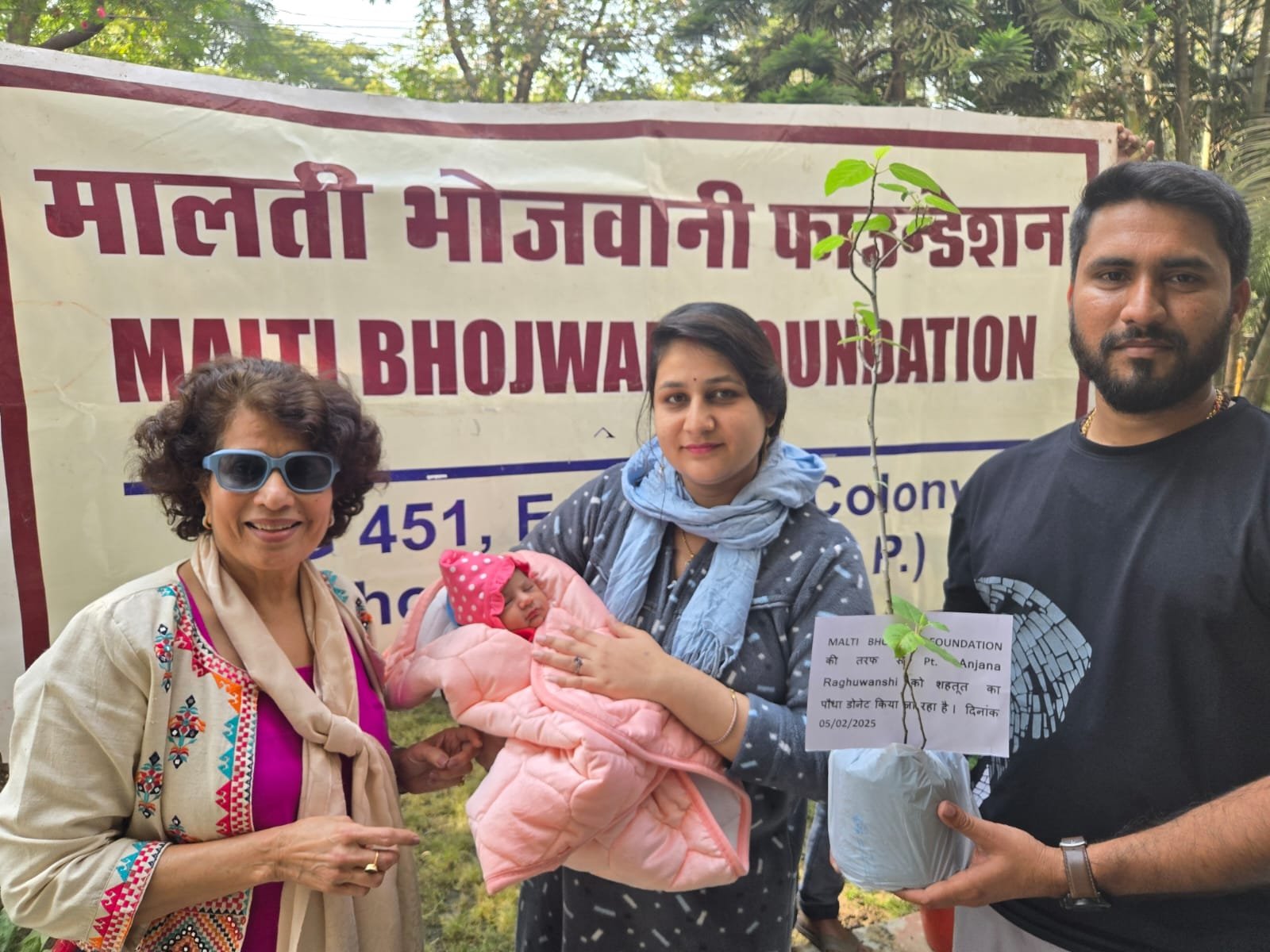 Malti Hospital & Test Tube Baby Centre and Malti Bhojwani Foundation supporting a newborn family with plantation and care kits in Bhopal.